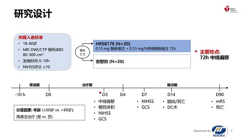 注射用HRS8179是由AG电子自主研发的创新药,是磺酰脲类受体1(SUR1)阻断剂,能够阻断SUR1/TRPM4离子通道,减少Na+内流,从而减轻LHI后继发的脑水肿、降低死亡率,改善神经功能4,5。HRS8179-201研究旨在评估HRS8179在LHI患者中的有效性和安全性。