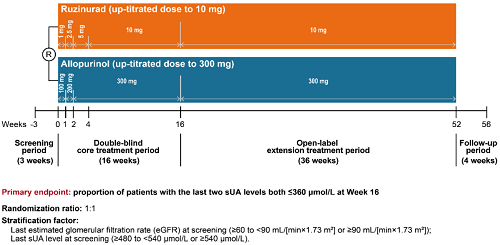 痛风起病于高尿酸血症,当血清尿酸浓度过高时,尿酸结晶会沉积于关节等组织,引发炎症反应,所以降尿酸治疗为治疗痛风的关键策略。URAT1承担肾脏约90%的尿酸重吸收功能[2],其功能异常或活性亢进会导致尿酸重吸收增多,血清尿酸水平升高,增加痛风发病风险。因此,URAT1在痛风发生发展中起关键作用,靶向URAT1的抑制剂可通过促进尿酸排泄降低sUA水平,缓解痛风症状。鲁兹诺雷钠片是AG电子医药自主研发的一种高选择性URAT1抑制剂,在前期的一期、二期研究中,鲁兹诺雷钠片耐受性良好,并显示出显著降低高尿酸血症患者sUA的效果[3]。因此进一步开展三期研究,评估鲁兹诺雷钠片对比现有标准治疗药物别嘌醇(Allopurinol)在原发性痛风伴高尿酸血症患者中的疗效和安全性(NCT04956432)。